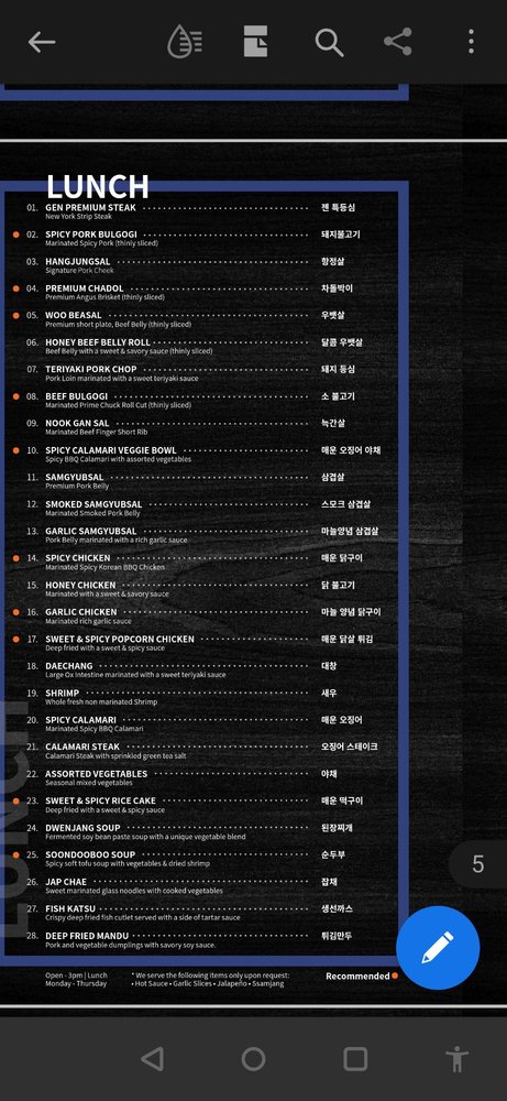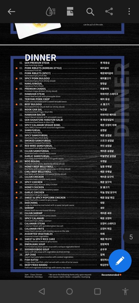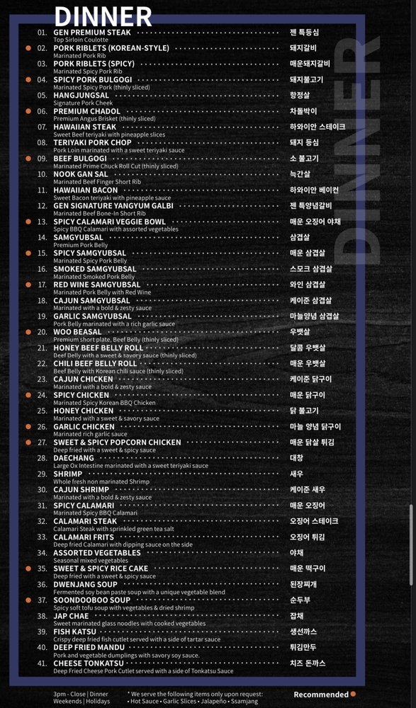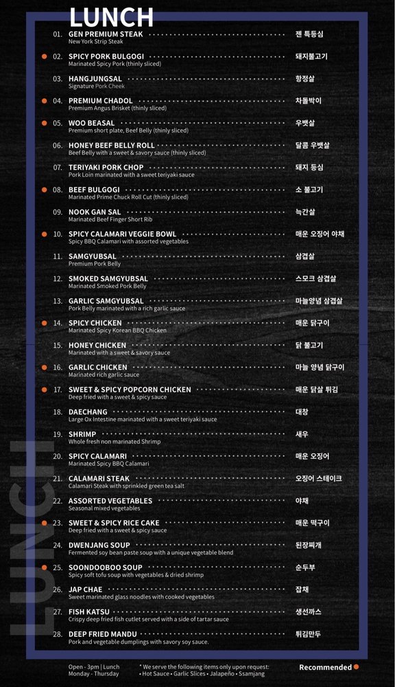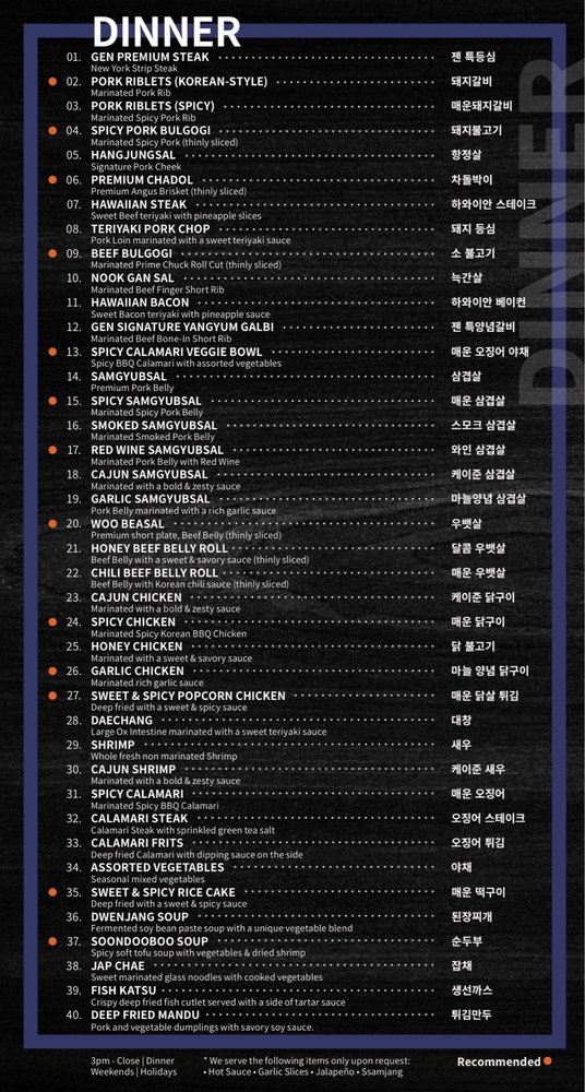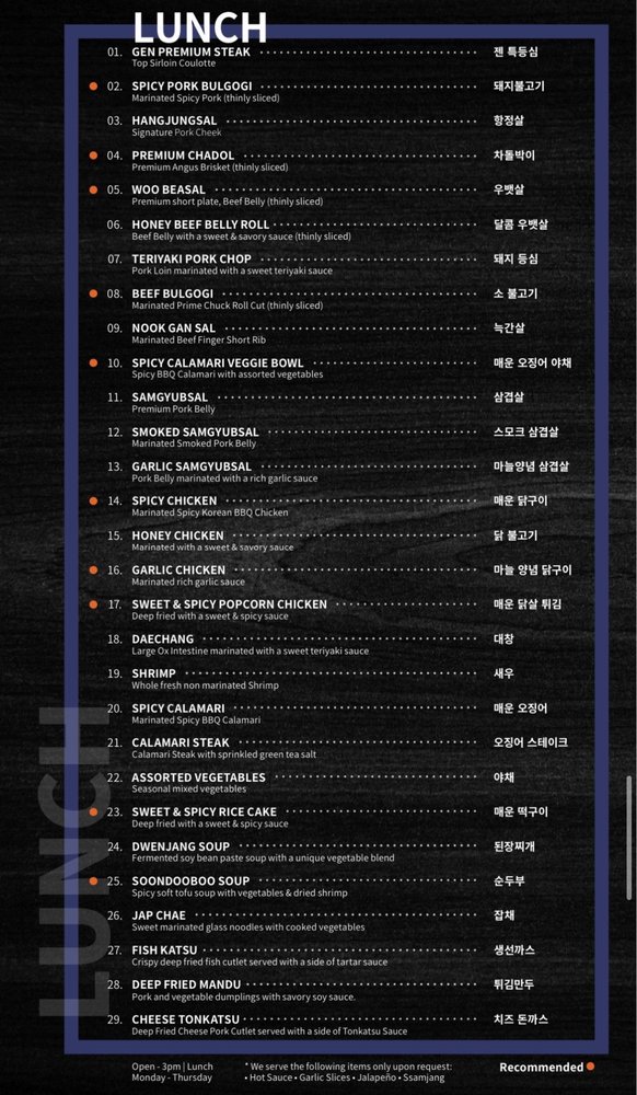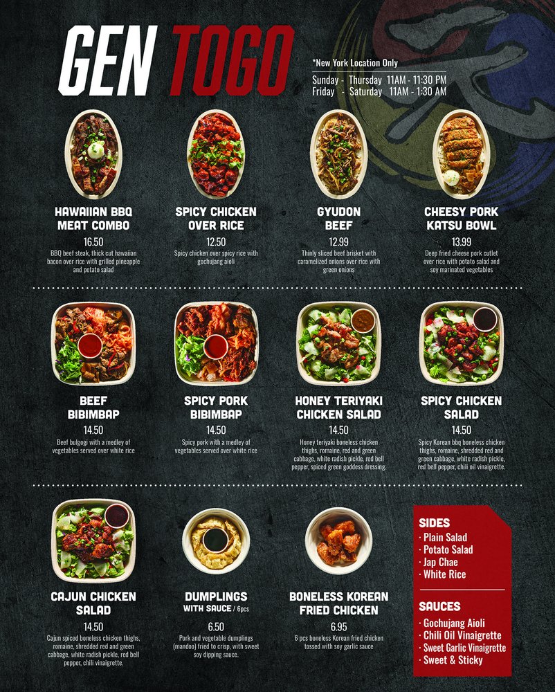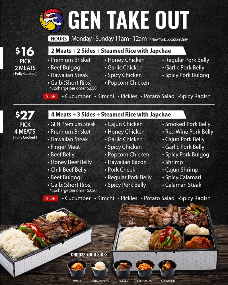 Introducing the menu at Gen Korean BBQ House, a trendy and casual spot in New York City specializing in Korean and Asian fusion barbecue. This restaurant offers a variety of meats that are grilled at your table, creating an interactive dining experience. The menu includes a wide selection of high-quality cuts of meat, along with delicious side dishes and sauces to complement the flavors. The ambiance is energized and perfect for group dinners. Gen Korean BBQ House also offers outdoor seating, delivery, takeout, and waiter service. With attentive staff members and a diverse menu, this restaurant is a must-visit for anyone craving flavorful Korean barbecue in a lively atmosphere.